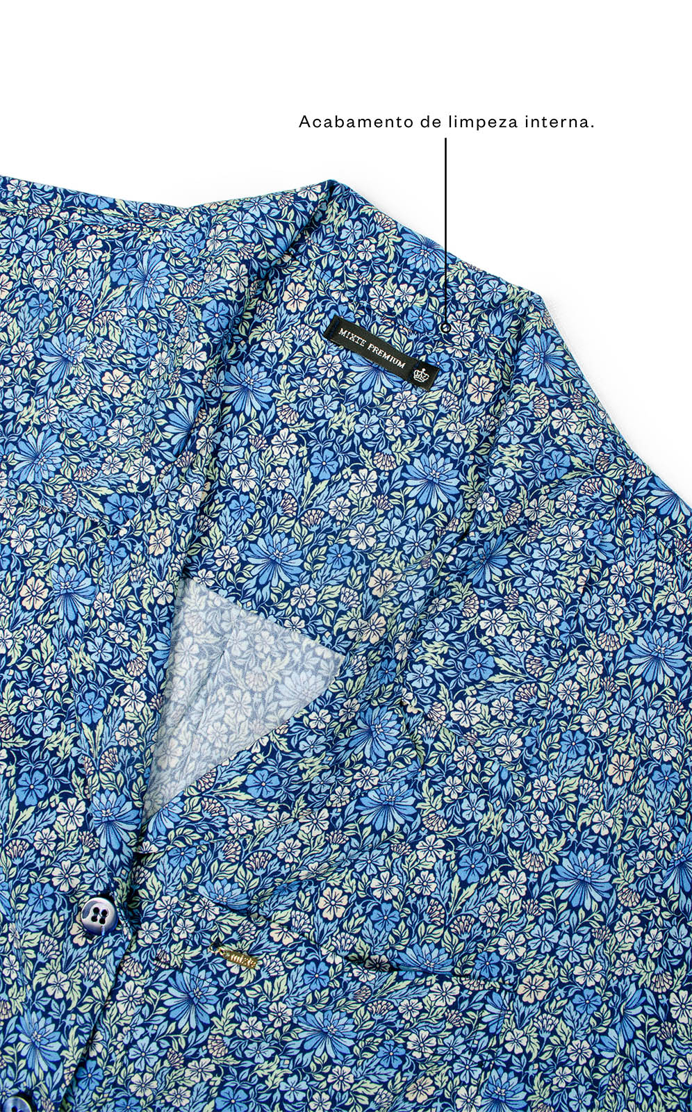 • Botões de madrepérola real costurados com lançadeira (não descosturam).