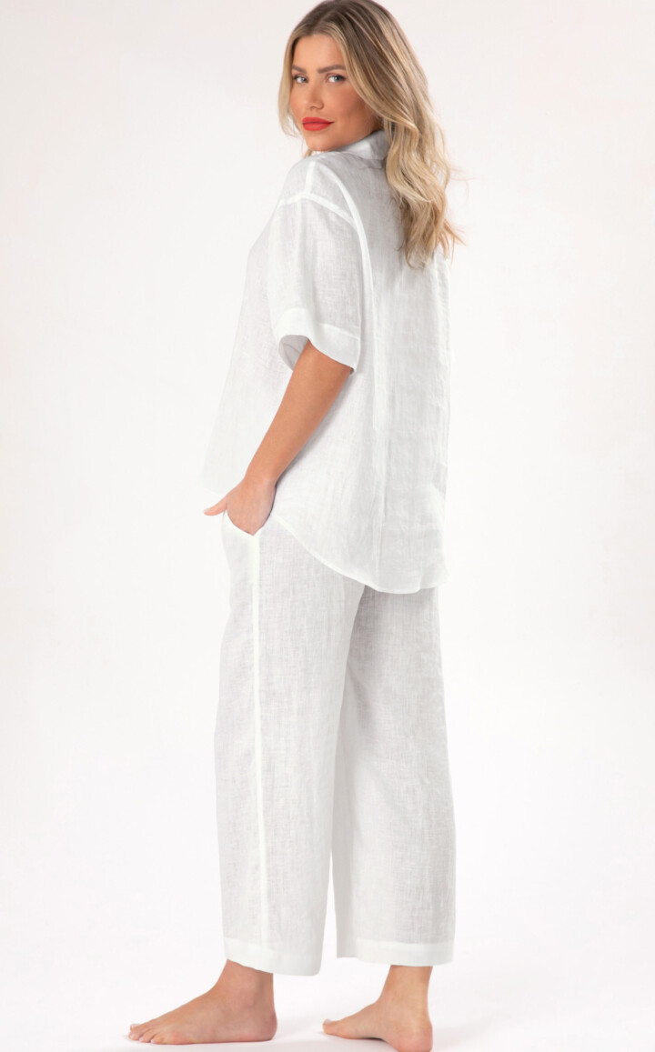 O tecido quintessencial do verão: totalmente natural, o fio de linho é um tecido durável e forte, porém leve e respirável. Por ser uma fibra com trama mais grossa, o tecido é menos propenso a se agarrar na pele, descansando sobre ela com sua textura refrescante e ondulada. O amassado é belo — esqueça o ferro de passar por alguns dias: estes conjuntos ficam melhores quanto mais forem utilizados e ganham beleza ao passar do tempo.