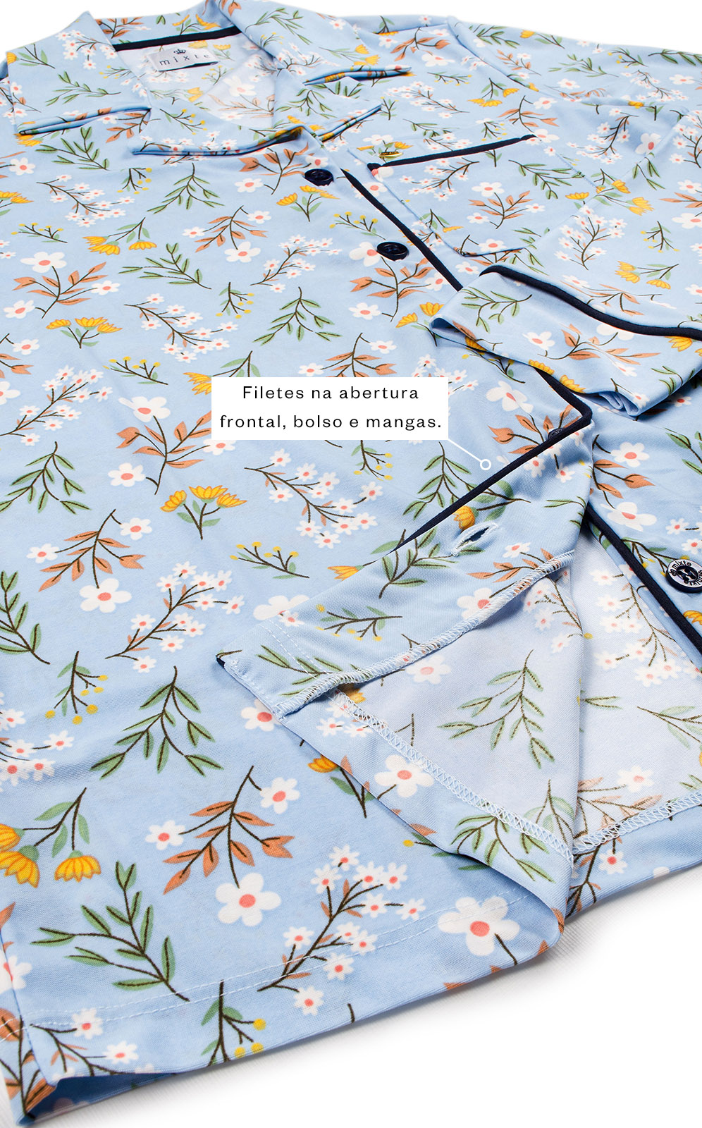 • Filetes na abertura frontal, bolso e mangas.