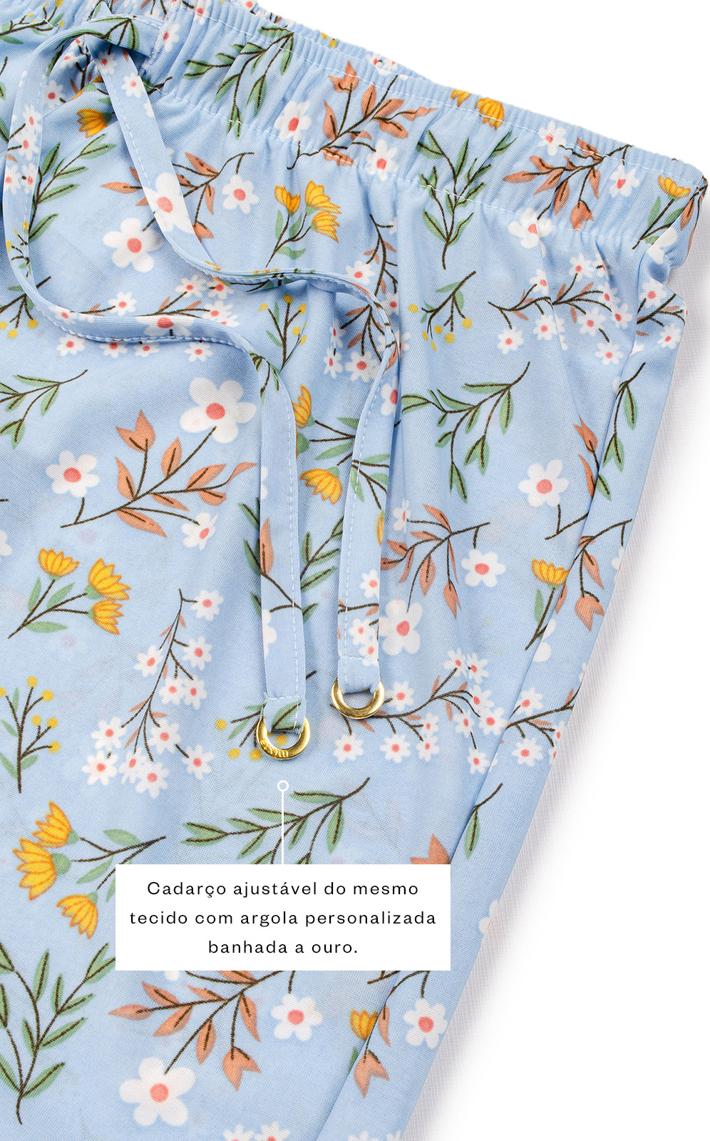 • Cadarço ajustável do mesmo tecido com argola personalizada banhada a ouro.